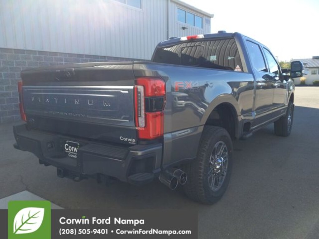 Our diesel-driven 2025 Ford F-350 Platinum Crew Cab 4X4 with the FX4 Off-Road Package combines raw power and refined luxury in Carbonized Gray Metallic! Motivated by a TurboCharged 6.7 Liter High Output PowerStroke Diesel V8 delivering 500hp and 1200lb-ft of torque to a 10 Speed Automatic transmission. That lets our Four Wheel Drive truck tow, haul, and take on your world without breaking a sweat. A mighty grille helps you make a bold impression with Ford F-350 details like LED lighting, fog lamps, power running boards, FX4 Off-Road Pack's skid plates, FX4 Decals, hill descent control, off-road specifically tuned shock absorbers, a power tailgate, a Pro Power Onboard generator, and striking alloy wheels.