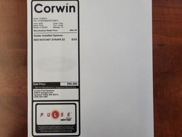 Ford emphasizes safety with front/rear automatic braking, trailer-compatible blind-spot monitoring, a 360-degree camera system, front/rear parking sensors, hill-start assist, trailer reverse guidance, trailer-sway control, and our Tremor Pack's lane-departure warning, and more. With all that, our F-350 Lariat earns the Super Duty seal of approval! Save this Page and Call for Availability. We Know You Will Enjoy Your Corwin Ford Spokane Test Drive Towards Ownership! See us today at Corwin Ford Spokane. Family owned for over 100 years! Excellent selection of New and Used vehicles, Financing options. Serving Spokane, Pasco, Kennewick, Richland, Walla Walla, Hermiston, Umatilla, Yakima, Sunnyside, Grandview, Dayton, Prescott, Denton County, Franklin County, Yakima County, Spokane County, Adams County, Grant County, and the Greater Columbia Basin. *All Prices plus applicable sales tax, license, and a negotiable documentary service fee up to $200 may be added to sales price or capitalized cost of the vehicle. One vehicle unless otherwise noted and subject to prior sale without notice. While supplies last. EPA mileage estimates are for newly manufactured vehicles only. Your actual mileage will vary depending on how you drive and maintain your vehicle. Price includes: $1000 - Final Days Mega Bonus Cash. Exp. 01/02/2026 Price includes dealer added accessories.