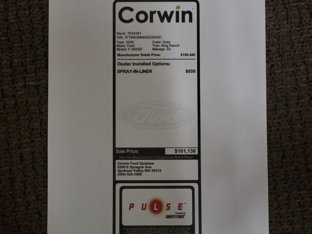 Ford supports on-the-job safety with a head-up display, front/rear automatic braking, trailer-compatible blind-spot monitoring, a 360-degree camera system, lane-keeping assistance, trailer reverse guidance, trailer-sway control, and more. With all that, our F-350 King Ranch earns the Super Duty seal of approval! Save this Page and Call for Availability. We Know You Will Enjoy Your Corwin Ford Spokane Test Drive Towards Ownership! See us today at Corwin Ford Spokane. Family owned for over 100 years! Excellent selection of New and Used vehicles, Financing options. Serving Spokane, Pasco, Kennewick, Richland, Walla Walla, Hermiston, Umatilla, Yakima, Sunnyside, Grandview, Dayton, Prescott, Denton County, Franklin County, Yakima County, Spokane County, Adams County, Grant County, and the Greater Columbia Basin. *All Prices plus applicable sales tax, license, and a negotiable documentary service fee up to $200 may be added to sales price or capitalized cost of the vehicle. One vehicle unless otherwise noted and subject to prior sale without notice. While supplies last. EPA mileage estimates are for newly manufactured vehicles only. Your actual mileage will vary depending on how you drive and maintain your vehicle. Price includes: $1500 - Retail Customer Cash. Exp. 03/31/2026 Price includes dealer added accessories.
