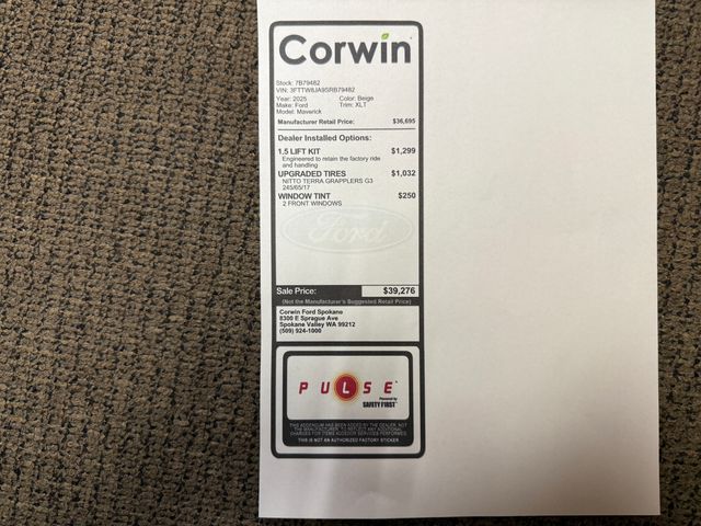 Ford's signature Co-Pilot360 systems can boost your peace of mind with automatic braking, pedestrian detection, forward collision warning, a rearview camera, tire pressure monitoring, ABS, Safety Canopy airbags, and more. Our Maverick XLT is designed to get things done! Save this Page and Call for Availability. We Know You Will Enjoy Your Corwin Ford Spokane Test Drive Towards Ownership! See us today at Corwin Ford Spokane. Family owned for over 100 years! Excellent selection of New and Used vehicles, Financing options. Serving Spokane, Pasco, Kennewick, Richland, Walla Walla, Hermiston, Umatilla, Yakima, Sunnyside, Grandview, Dayton, Prescott, Denton County, Franklin County, Yakima County, Spokane County, Adams County, Grant County, and the Greater Columbia Basin. *All Prices plus applicable sales tax, license, and a negotiable documentary service fee up to $200 may be added to sales price or capitalized cost of the vehicle. One vehicle unless otherwise noted and subject to prior sale without notice. While supplies last. EPA mileage estimates are for newly manufactured vehicles only. Your actual mileage will vary depending on how you drive and maintain your vehicle. Price includes: $1000 - Final Days Mega Bonus Cash. Exp. 01/02/2026 $1000 - Retail Customer Cash. Exp. 01/05/2026