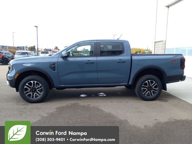 Our 2025 Ford Ranger Lariat SuperCrew 4X4 with the FX4 Off-Road Package combines modern muscle and smart technology in Azure Gray Metallic Tri-coat! Powered by a TurboCharged 2.3 Liter EcoBoost 4 Cylinder generating 270hp for a 10 Speed SelectShift Automatic transmission to help make tough challenges feel easy. This Four Wheel Drive truck can inspire confidence with the FX4 Off-Road Pack's electronic locking rear differential, trail control, off-road tuned shocks, composed handling, and achieve nearly 25mpg on the highway. Our Ranger is ready to rock with its LED lighting, fog lamps, zone/cargo-bed lighting, a steel rear bumper, a power-locking tailgate, a 120V/400W outlet, alloy wheels, and heated power mirrors.