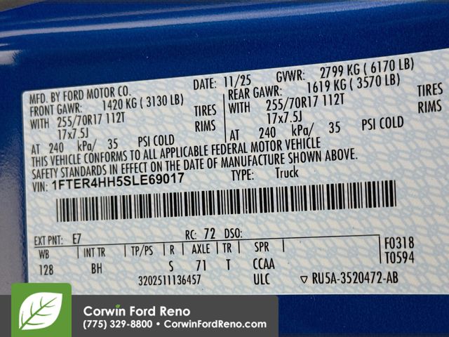 See us today at Corwin Ford Reno or call us at (775) 329-8800. Family owned for over 100 years! Excellent selection of New and Used vehicles, Financing options. Serving Reno, Carson City, Sparks, the North Valleyâs, Spanish Springs, Verdi, Virginia City, the Carson Valley, and Northern Nevada. *All Prices plus applicable sales tax, and a license, and documentary service fee of $627.75 will be added to sales price or capitalized cost of the vehicle. One vehicle unless otherwise noted and subject to prior sale without notice. While supplies last. EPA mileage estimates are for newly manufactured vehicles only. Your actual mileage will vary depending on how you drive and maintain your vehicle. Rebates included: $1000 - Final Days Mega Bonus Cash. Exp. 01/02/2026 $2000 - Bonus Customer Cash. Exp. 01/05/2026