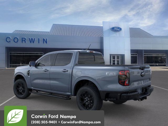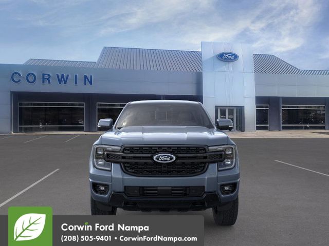 Our 2025 Ford Ranger Lariat SuperCrew 4X4 with the FX4 Off-Road Package combines modern muscle and smart technology in Azure Gray Metallic Tri-coat! Powered by a TurboCharged 2.3 Liter EcoBoost 4 Cylinder generating 270hp for a 10 Speed SelectShift Automatic transmission to help make tough challenges feel easy. This Four Wheel Drive truck can inspire confidence with the FX4 Off-Road Pack's electronic locking rear differential, trail control, off-road tuned shocks, composed handling, and achieve nearly 25mpg on the highway. Our Ranger is ready to rock with its LED lighting, fog lamps, zone/cargo-bed lighting, a steel rear bumper, a power-locking tailgate, a 120V/400W outlet, alloy wheels, and heated power mirrors.