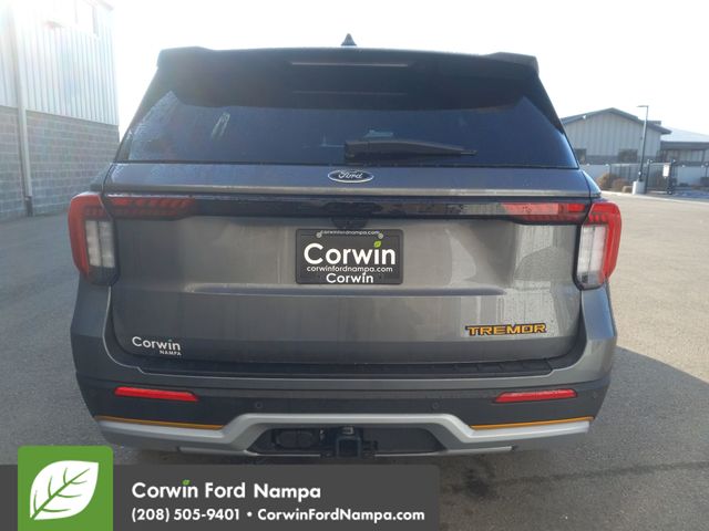 Our 2026 Ford Explorer Tremor 4WD, equipped with the Ultimate Package in Carbonized Gray Metallic, delivers rugged suspension, all-terrain confidence, and bold style for off-road family adventures. Powered by a TurboCharged 3.0 Liter EcoBoost V6 offering 400hp to a 10 Speed Automatic transmission with seven drive modes. Take off with terrain management to be ready for the rough stuff, and this Four Wheel Drive SUV returns nearly 27mpg on the highway. Strong lines give our Explorer a muscular look that complements the Ultimate Pack's features, including a sunroof, LED lighting, power liftgate, taller ride height, roof rails, front skid plate trim, all-terrain tires, alloy wheels, and body cladding featuring Tremor badges.