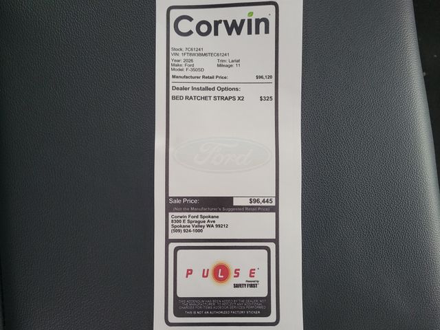 Ford emphasizes safety with front/rear automatic braking, trailer-compatible blind-spot monitoring, a 360-degree camera system, front/rear parking sensors, hill-start assist, trailer reverse guidance, trailer-sway control, and more. With all that, our F-350 Lariat earns the Super Duty seal of approval! Save this Page and Call for Availability. We Know You Will Enjoy Your Corwin Ford Spokane Test Drive Towards Ownership! See us today at Corwin Ford Spokane. Family-owned for over 100 years! Excellent selection of New and Used vehicles, Financing options. Serving Spokane, Pasco, Kennewick, Richland, Walla Walla, Hermiston, Umatilla, Yakima, Sunnyside, Grandview, Dayton, Prescott, Denton County, Franklin County, Yakima County, Spokane County, Adams County, Grant County, and the Greater Columbia Basin. *All Prices plus applicable sales tax, license, and a negotiable documentary service fee up to $200 may be added to sales price or capitalized cost of the vehicle. One vehicle unless otherwise noted and subject to prior sale without notice. While supplies last. EPA mileage estimates are for newly manufactured vehicles only. Your actual mileage will vary depending on how you drive and maintain your vehicle. Price includes dealer added accessories.