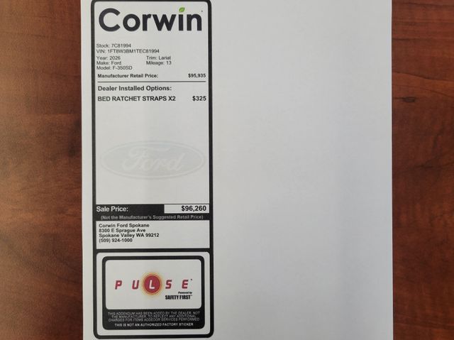Ford emphasizes safety with front/rear automatic braking, trailer-compatible blind-spot monitoring, a 360-degree camera system, front/rear parking sensors, hill-start assist, trailer reverse guidance, trailer-sway control, and more. With all that, our F-350 Lariat earns the Super Duty seal of approval! Save this Page and Call for Availability. We Know You Will Enjoy Your Corwin Ford Spokane Test Drive Towards Ownership! See us today at Corwin Ford Spokane. Family owned for over 100 years! Excellent selection of New and Used vehicles, Financing options. Serving Spokane, Pasco, Kennewick, Richland, Walla Walla, Hermiston, Umatilla, Yakima, Sunnyside, Grandview, Dayton, Prescott, Denton County, Franklin County, Yakima County, Spokane County, Adams County, Grant County, and the Greater Columbia Basin. *All Prices plus applicable sales tax, license, and a negotiable documentary service fee up to $200 may be added to sales price or capitalized cost of the vehicle. One vehicle unless otherwise noted and subject to prior sale without notice. While supplies last. EPA mileage estimates are for newly manufactured vehicles only. Your actual mileage will vary depending on how you drive and maintain your vehicle. Price includes dealer added accessories.