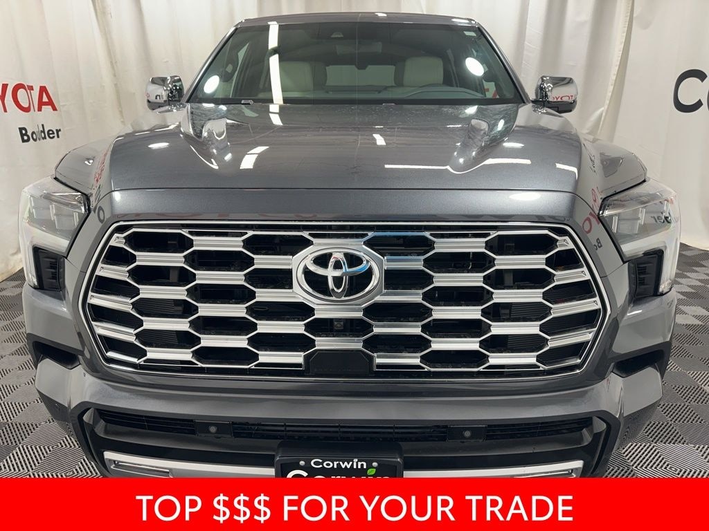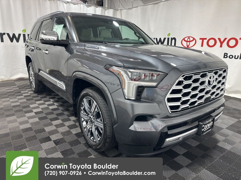 Command the road in our 2025 Toyota Sequoia Capstone 4WD in Midnight Black Metallic, a flagship full-size SUV that delivers premium luxury, advanced hybrid power, and rugged 4WD performance, perfect for upscale family travel, off-road adventures, and bold towing capability! Motivated by a Twin-TurboCharged 3.4 Liter i-FORCE MAX Hybrid V6 and an Electric Motor generating a combined 437hp for a 10 Speed Automatic transmission with Tow/Haul and Sport modes. An automatic limited-slip differential helps deliver sure-footed confidence on your family's next epic adventure, and this Four Wheel Drive SUV returns nearly 22mpg on the highway. Our Sequoia's exterior sends a bold message with a panoramic sunroof, LED lighting, fog lamps, power running boards, chrome-plated mirror caps, satin chrome-plated roof rails, and 22-inch alloy wheels.