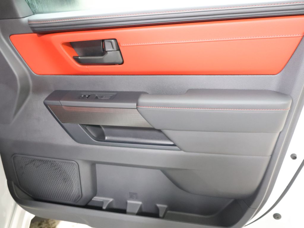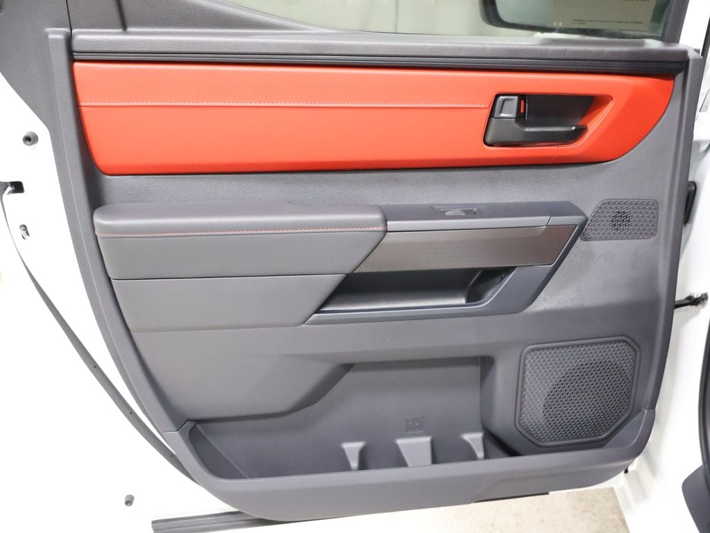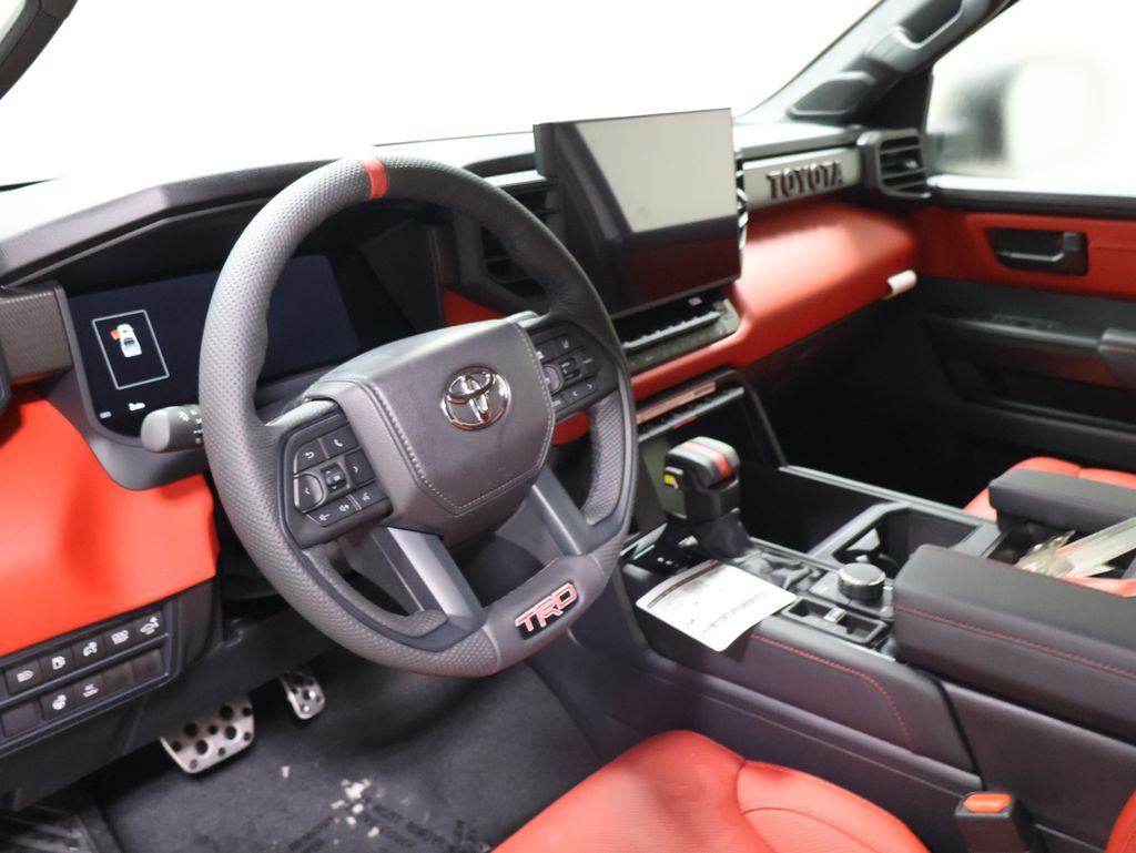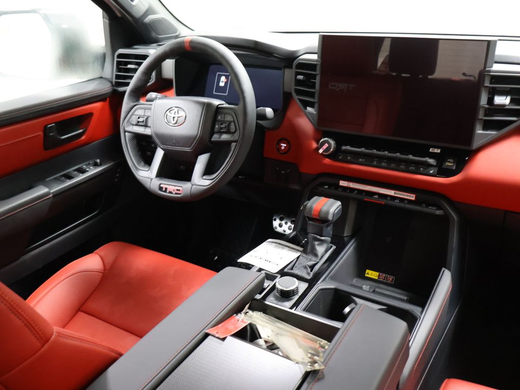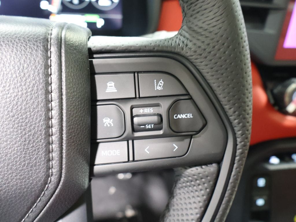 • TRD leather-wrapped manual tilt/telescopic steering wheel with TRD badge, red center stripe, and phone, audio, display/infotainment, and Driver Assist controls
