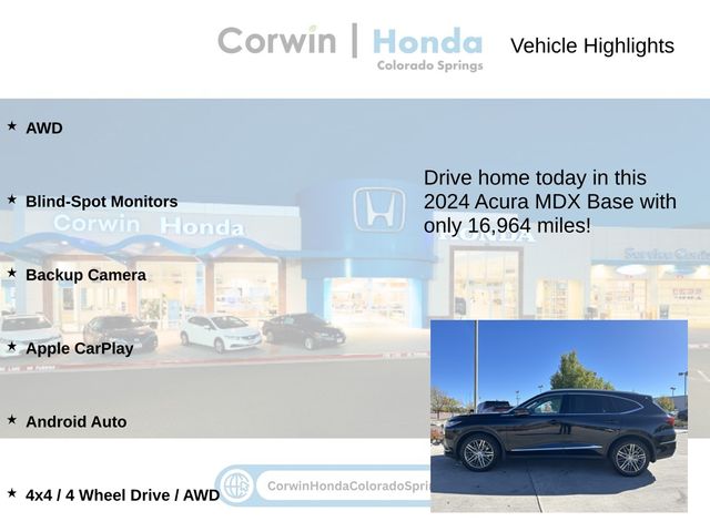 This Acura MDX is well equipped and includes the following features and benefits, AWD, Blind-Spot Monitors, Backup Camera, Apple CarPlay, Android Auto, 4x4 / 4 Wheel Drive / AWD, Front And Rear Parking Sensors Traffic Jam Assist Side Impact Beams Dual Stage Driver And Passenger Seat-Mounted Side Airbags Blind Spot Information System (BSI) Blind Spot Collision Mitigation Braking System (CMBS) and Rear Cross Traffic Monitor Collision Mitigation-Front Driver Monitoring-Alert Rear Cross Traffic Monitor Collision Mitigation Braking System (CMBS) Surround View Back-Up Camera w/Washer Aerial View Camera System Back-Up Camera w/Washer Dual Stage Driver And Passenger Front Airbags Curtain 1st, 2nd And 3rd Row Airbags Airbag Occupancy Sensor Driver And Passenger Knee Airbag Rear Child Safety Locks Outboard Front Lap And Shoulder Safety Belts -inc: Rear Center 3 Point, Height Adjusters and Pretensioners Right Side Camera Left Side Camera Front Camera, Real-Time Traffic Display 16 Speakers A/V Remote 1 LCD Monitor In The Front Graphic Equalizer Fixed Antenna Radio w/Seek-Scan, Clock, Steering Wheel Controls and Radio Data System Radio: ELS Studio 3D Premium Audio System -inc: 16-speakers, 12.3" HD dual-content center display w/True Touch Interface, Wi-Fi hotspot capability, Acura navigation system w/3D view, AcuraLink Real-Time Traffic w/street and freeway conditions, Traffic Rerouting, natural language voice recognition, AcuraLink connected services, AcuraLink security and remote services (3 years), wireless Apple CarPlay and Android Auto compatibility, Alexa built-in, Bluetooth HandsFreeLink wireless telephone interface, HD Radio, SiriusXM (SiriusXM requires a subscription after any trial period, If you decide to continue you SiriusXM service at the end of your trial subscription, the plan you choose will automatically renew and bill at then-current rates until you call SiriusXM at 1-866-635-2349 to cancel, See our customer agreement for complete terms at www.siriusxm.com, Fees and programming subject to change, Available in the 48 contiguous United States and D.C.), USB audio interface, Bluetooth streaming audio and Speed-Sensitive Volume Compensation (SVC). Odometer is 13404 miles below market average!