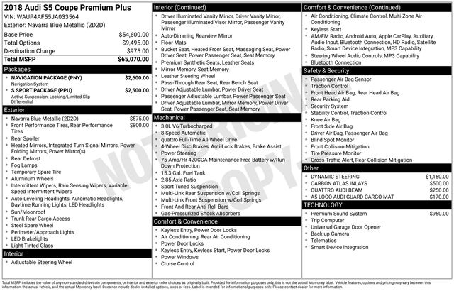 2018 Audi S5 3.0T Premium Plus quattro quattro 8-Speed Automatic with Tiptronic 3.0L TFSI Blue Metallic 21/30 City/Highway MPG