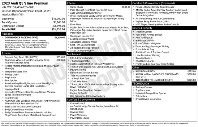 Indulge in the convenience of the Convenience Package, which includes features like Driver Seat Memory, SiriusXM with 360L, a 3-month platinum plan trial subscription, a Heated Steering Wheel, Audi Advanced Key, and Auto-Dimming Power Folding Exterior Mirrors. The 19" 5-Double-Arm Design Bi-Color Finish wheels and Tires add a touch of elegance and sportiness to the already impressive exterior.