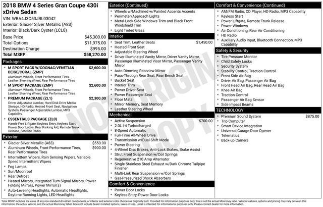 2018 BMW 4 Series 430i Gran Coupe AWD 8-Speed Automatic Sport 2.0L 4-Cylinder DOHC 16V Turbocharged Glacier Silver Metallic 23/33 City/Highway MPG