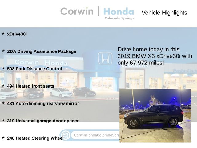 This BMW X3 is well equipped and includes the following features and benefits, xDrive30i, ZDA Driving Assistance Package, 508 Park Distance Control, 494 Heated front seats, 431 Auto-dimming rearview mirror, 319 Universal garage-door opener, 248 Heated Steering Wheel. Odometer is 2122 miles below market average! 22/29 City/Highway MPG