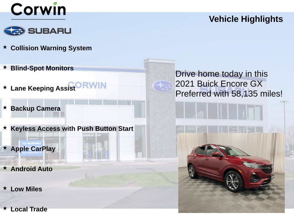 Discover the perfect blend of style, technology, and capability with this exceptional 2021 Buick Encore GX Preferred. This versatile crossover SUV is designed to elevate your driving experience, offering a compelling combination of features that cater to your every need.