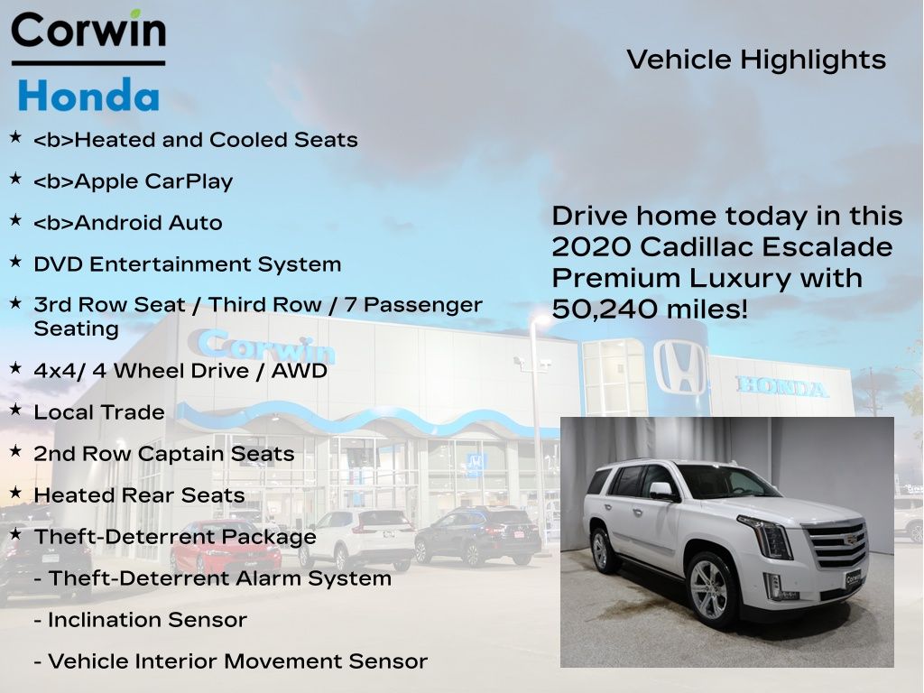 SAVE BIG IN 2026 WITH A GREAT DEAL ON ONE OF OVER 200 PRE-OWNED VEHICLE'S AT CORWIN HONDA. Recent Arrival! 2020 Crystal White Tricoat Cadillac Escalade Premium Luxury 4WD