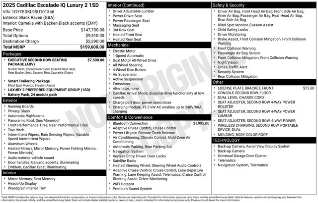 Whether you're seeking a family-friendly SUV, a sophisticated executive vehicle, or a statement of automotive excellence, the 2025 Cadillac Escalade IQ Luxury 2 is the ultimate choice. Experience the future of luxury driving today and schedule a test drive at our showroom. We're confident that once you experience the Escalade IQ, you'll be captivated by its unrivaled blend of performance, technology, and style.