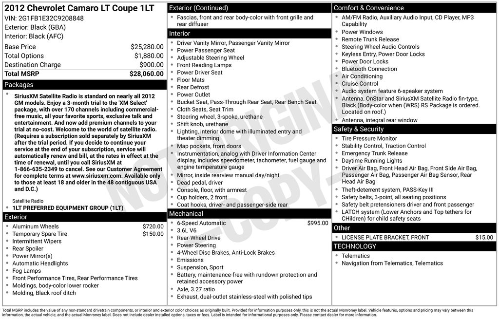 With its sleek styling, powerful engine, and impressive list of features, the 2012 Chevrolet Camaro 1LT is a sports car that demands attention. Whether you're seeking an exhilarating driving experience or a head-turning daily companion, this Camaro is ready to exceed your expectations.
