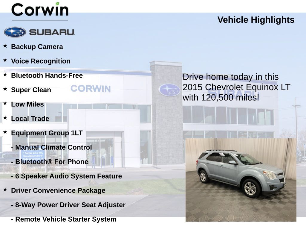 Whether you're navigating the city streets or exploring the open road, this 2015 Chevrolet Equinox LT 1LT is the perfect companion. Experience the exceptional value and quality that Chevrolet is known for. Schedule a test drive today and discover why this Equinox should be your next SUV.