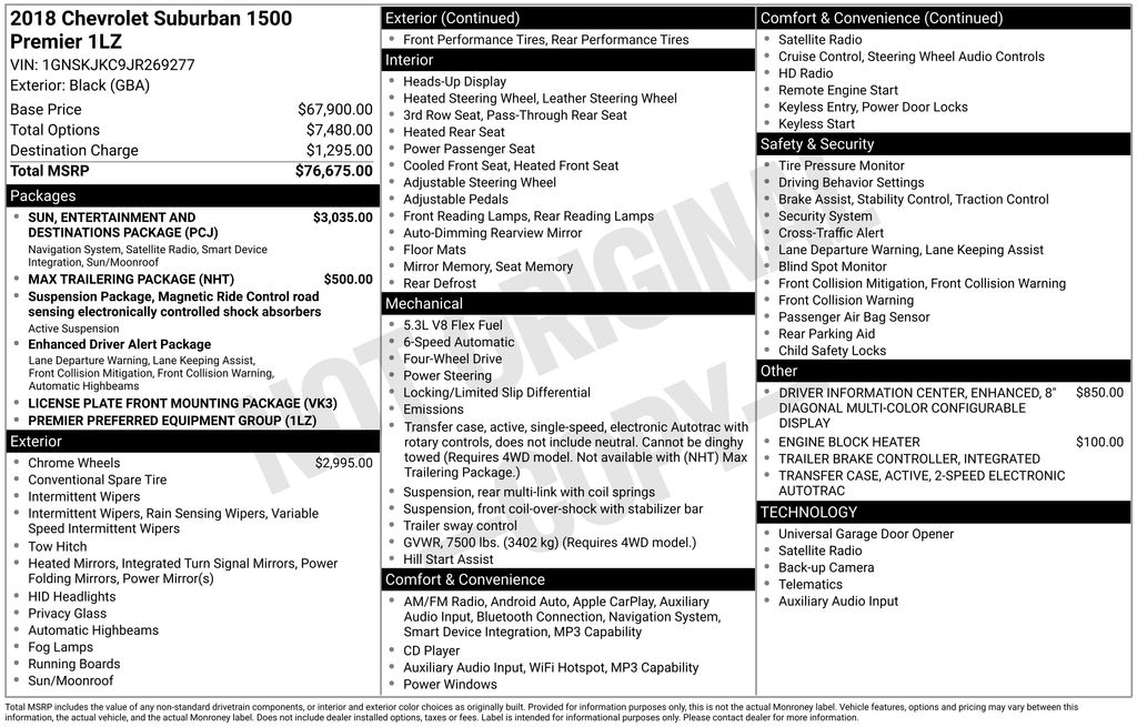 This Chevrolet Suburban is well equipped and includes these key features and benefits, Heated and Cooled Seats, Navigation System, Touchscreen Controls, Backup Camera, Automatic Headlights, Bluetooth Handsfree, AWD / 4x4 / Four Wheel, 12-Volt Auxiliary Power Outlet (5), 1st & 2nd Row Color-Keyed Carpeted Floor Mats, 2-Speed Active Electronic AutoTrac Transfer Case, 3.42 Rear Axle Ratio, 3rd Row 60/40 Power Fold Split-Bench, 4-Wheel Antilock Disc Brakes, 6-Way Power Front Passenger Seat Adjuster, Auto-Dimming Inside Rear-View Mirror, Black Assist Steps, Color-Keyed Carpeting Floor Covering, Driver Inboard & Front Passenger Airbags, Electronic Cruise Control w/Set & Resume Speed, Enhanced Driver Alert Package, Floor Console w/Storage Area, Fog Lamps, Forward Collision Alert, Front & Rear Park Assist, Hands Free Power Liftgate, HD Radio, Heated 2nd Row Outboard Seats, Heated Leather Wrapped Steering Wheel, Integrated Trailer Brake Controller, Intellibeam Headlamps w/Automatic High Beam On/Off, Lane Change Alert w/Side Blind Zone Alert, Lane Keep Assist w/Lane Departure Warning, License Plate Front Mounting Package, Low Speed Forward Automatic Braking, Magnetic Ride Control Suspension Package, Max Trailering Package, Memory Settings, Navigation System, OnStar Basic Plan For 5 Years, Passive Entry System, Power Folding & Adjustable Heated Outside Mirrors, Power Release 2nd Row Bucket Seats, Power Tilt & Telescoping Steering Column, Power Tilt-Sliding Sunroof w/Express-Open/Close, Power-Adjustable Accelerator & Brake Pedals, Preferred Equipment Group 1LZ, Push Button Keyless Start, Rear Cross-Traffic Alert, Rear Seat Entertainment System, Remote Vehicle Start, Roof-Mounted Luggage Rack Side Rails, Safety Alert Seat, SiriusXM Satellite Radio, Sun, Entertainment & Destinations Package, Universal Home Remote, Wireless Charging.