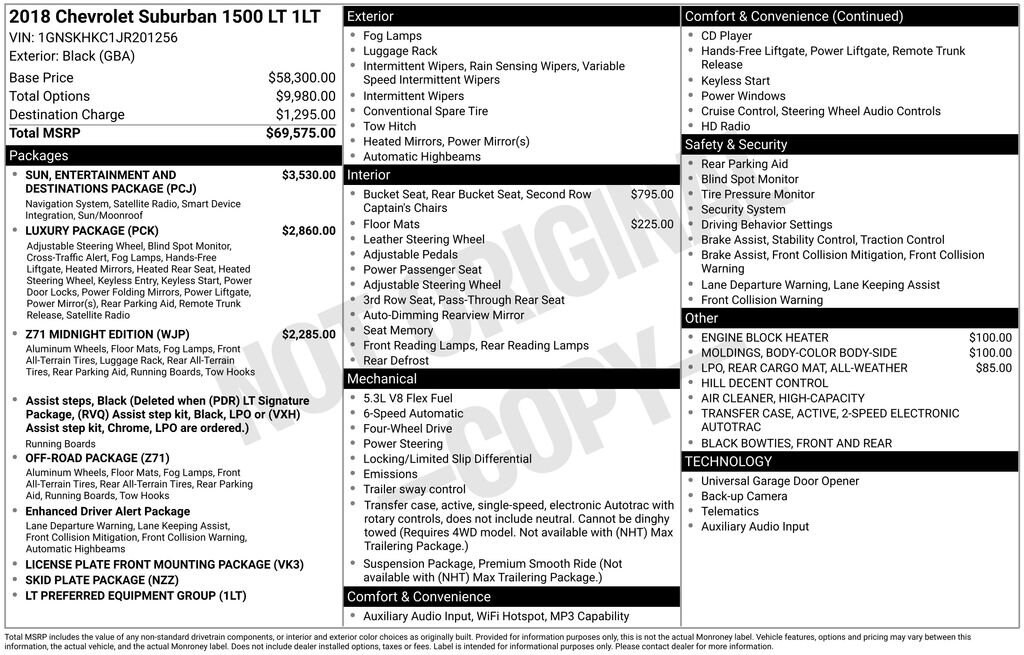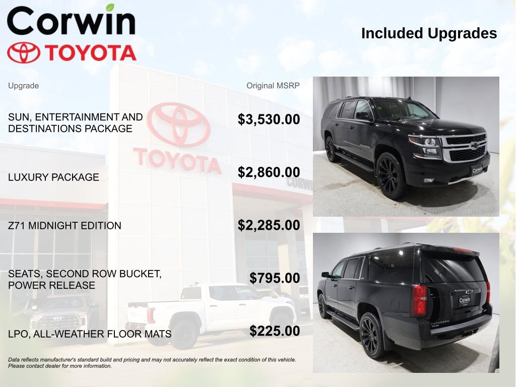 This Chevrolet Suburban is well equipped and includes the following features and benefits, 4x4 / 4 Wheel Drive / AWD, 2nd Row Pwr Release 60/40 Split Folding Bench Seat, 3rd Row 60/40 Power Fold Split-Bench, Black Roof Rack Cross Bars, Fog Lamps, Front & Rear Black Bow Ties, Front & Rear Park Assist, Hands Free Power Liftgate, Heated 2nd Row Outboard Seats, Heated Leather Wrapped Steering Wheel, Lane Change Alert w/Side Blind Zone Alert, Luxury Package, Memory Settings, Off-Road Z71 Suspension Package, Passive Entry System, Power Folding & Adjustable Heated Outside Mirrors, Power Tilt & Telescoping Steering Column, Power Tilt-Sliding Sunroof w/Express-Open/Close, Push Button Keyless Start, Radio: Chevrolet MyLink AM/FM Stereo w/Navigation, Rear Cross-Traffic Alert, Rear Seat Entertainment System, Sun, Entertainment & Destinations Package, Unique Z71 Midnight Grille, Wheels: 18" Black Painted Aluminum, Z71 Front Lower Black Fascia, Z71 Midnight Edition.