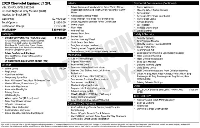 2020 Chevrolet Equinox LT FWD 6-Speed Automatic Electronic with Overdrive 1.5L DOHC Nightfall Gray Metallic 26/31 City/Highway MPG