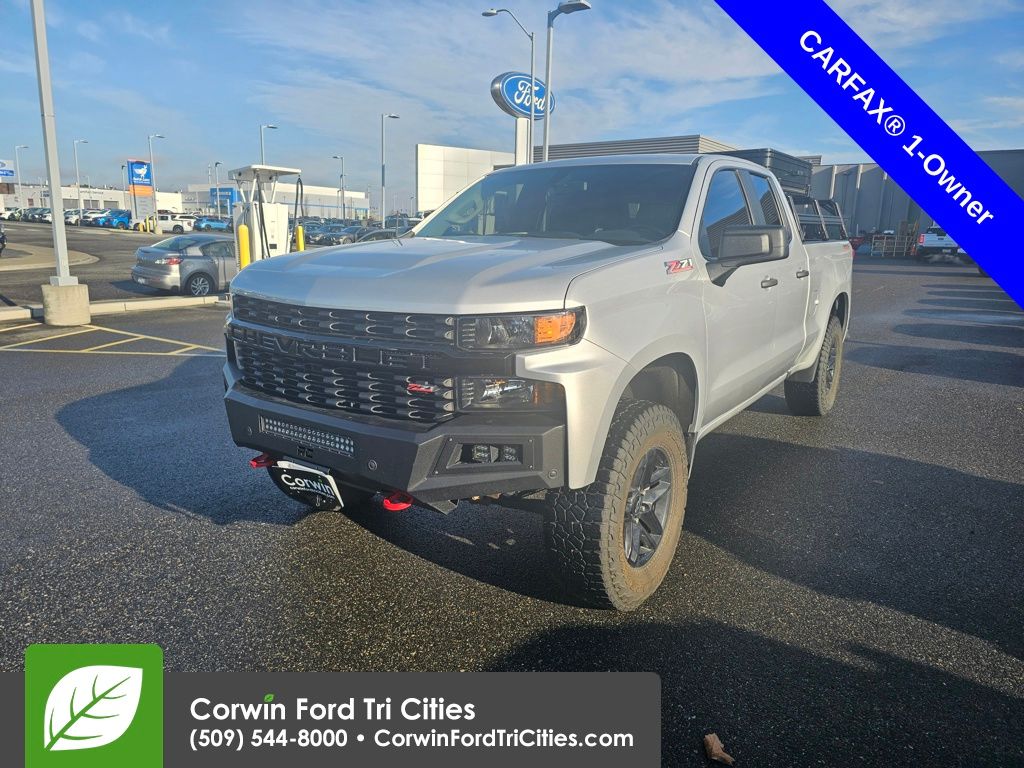 Meet our bold, Accident Free, One Owner 2020 Chevrolet Silverado 1500 Custom Trail Boss Double Cab 4X4 that's ready to take charge in Silver Ice Metallic! Powered by a 5.3 Liter EcoTec3 V8 generating 355hp paired to a 6 Speed Automatic transmission with tow/haul mode. Equipped with Z71 upgrades like a 2-inch lift, hill descent control, and off-road suspension, our Four Wheel Drive truck can dominate challenging terrain and scores nearly 20mpg on the highway. Our Silverado also features ruggedly handsome good looks thanks to LED lighting, skid plates, red recovery hooks, a trailer hitch, high-gloss black wheels, and matching fenders.