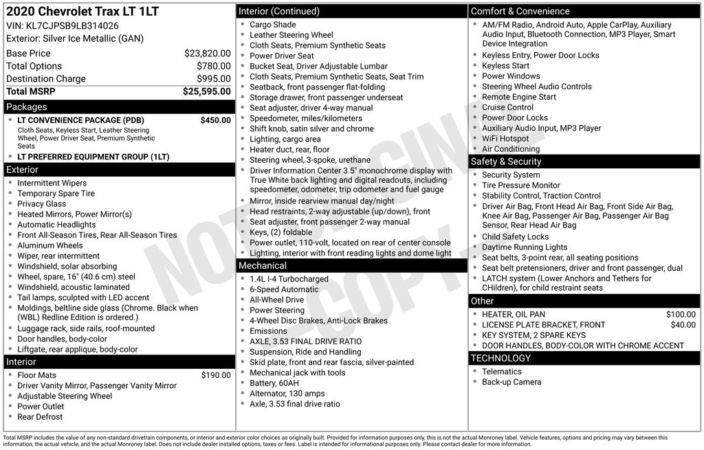 Discover the perfect balance of style, versatility, and performance in this 2020 Chevrolet Trax LT. With its sleek silver exterior and well-appointed interior, this compact SUV is ready to elevate your driving experience.