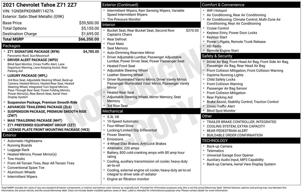 Whether you're tackling rugged terrain or navigating the daily commute, the 2021 Chevrolet Tahoe Z71 is the perfect companion. With its exceptional performance, premium amenities, and advanced safety features, this SUV is sure to exceed your expectations. Experience the power and refinement of the Tahoe Z71 for yourself â" visit our showroom today and let us demonstrate why this remarkable vehicle is the perfect choice for your next adventure.