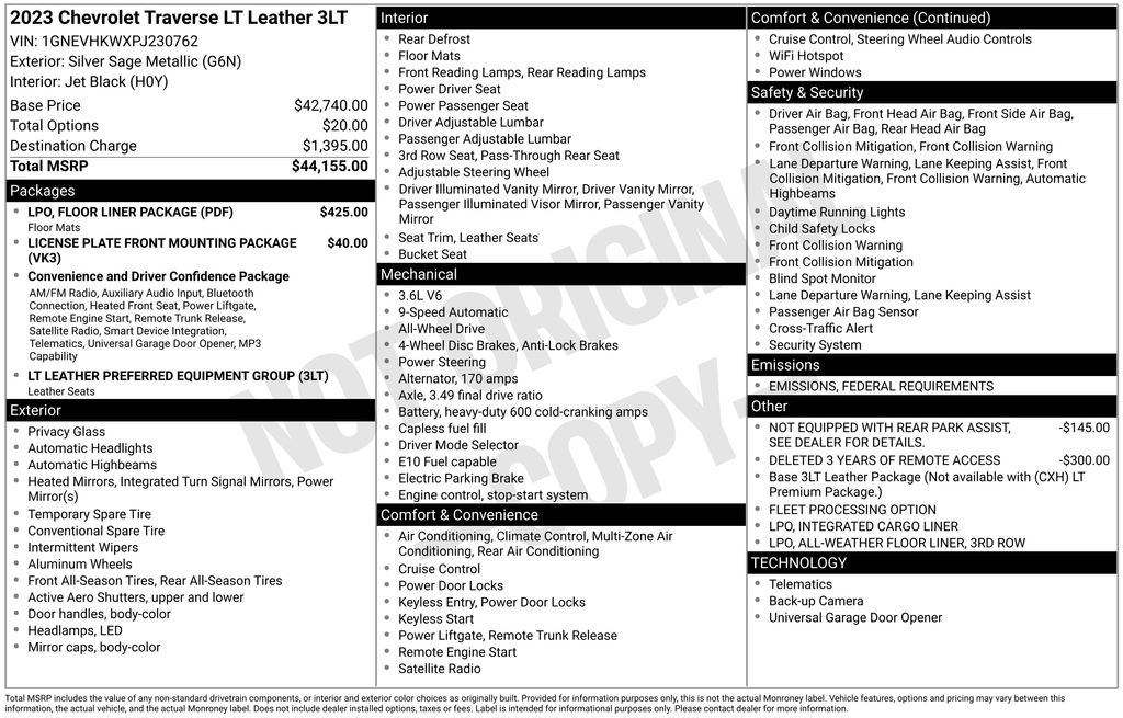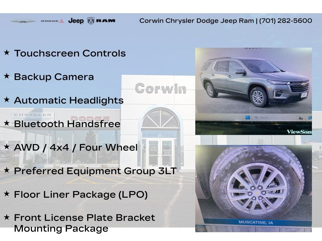This Chevrolet Traverse is well equipped and includes these key features and benefits, Touchscreen Controls, Backup Camera, Automatic Headlights, Bluetooth Handsfree, AWD / 4x4 / Four Wheel, 1st & 2nd Row All-Weather Floor Liner (LPO), 3rd Row All-Weather Floor Liner (LPO), Floor Liner Package (LPO), Front License Plate Bracket Mounting Package, Heated Driver & Front Passenger Seats, Integrated Cargo Liner (LPO), Power passenger seat, Preferred Equipment Group 3LT.