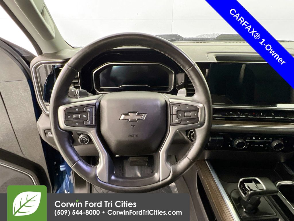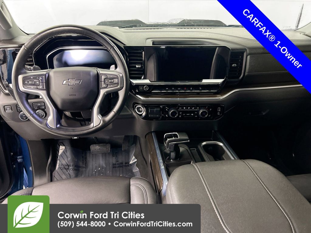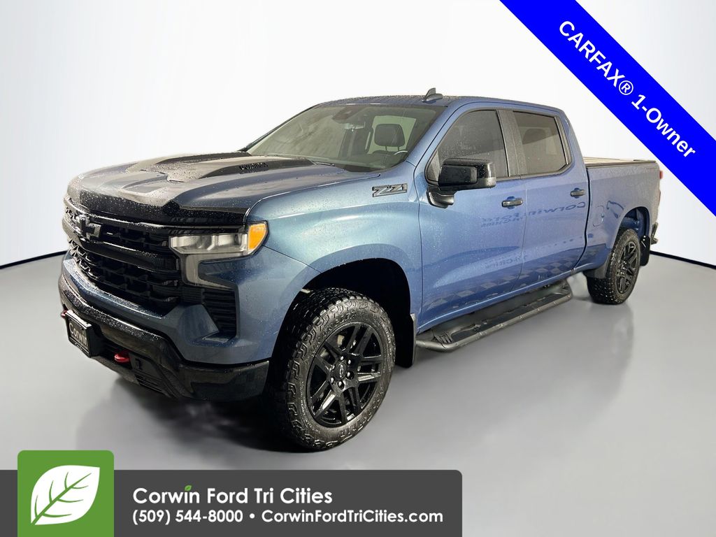 Our Diesel powered, Accident Free, One Owner 2024 Chevrolet Silverado 1500 LT Trail Boss Crew Cab 4X4 with the Convenience II Pack features advanced capability in Lakeshore Blue Metallic! Motivated by a TurboCharged 3.0 Liter DuraMax Diesel 6 Cylinder serving up 305hp and 495lb-ft of torque to a 10 Speed Automatic transmission for busy owners. Enjoy off-road action with a 2-speed transfer case, hill descent control, and a Z71 suspension with a 2-inch lift. This Four Wheel Drive truck also scores nearly 27mpg on the highway with a dominating design. Our Chevrolet Silverado boasts LED lighting, fog lamps, running boards, high-gloss black alloy wheels, a tonneau cover, an EZ Lift power lock/release tailgate, a trailer hitch, and a 120V outlet.