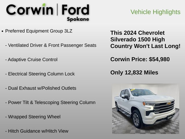 This Chevrolet Silverado 1500 is well equipped and includes these key features and benefits, Heated Seats, Blind-Spot Monitors, Touchscreen Controls, Backup Camera, Keyless Access with Push Button Start, Apple CarPlay, Android Auto, Bluetooth Hands-Free, Silverado 1500 High Country, 4D Crew Cab, 3.0L I6, 10-Speed Automatic, 4WD, Iridescent Pearl Tricoat, Jet Black/Nightshift Blue Leather, 10-Way Power Driver Seat w/Lumbar, 10-Way Power Passenger Seat Adjuster w/Lumbar, 12.3" Multicolor Reconfigurable Digital Display, 120-Volt Interior Power Outlet, 2 USB Data Ports, 2nd Row Heated Outboard Seats, Adaptive Cruise Control, Auto-Dimming Inside Rear-View Mirror, Auto-Locking Rear Differential, Bed View Camera, Bluetooth® For Phone, Body-Color Painted Mirror Caps, Chevytec Spray-On Black Bedliner, Chrome Assist Steps, Chrome Recovery Hooks, Color-Keyed Carpeting Floor Covering, Deep-Tinted Glass, Driver Memory, Dual Exhaust w/Polished Outlets, Dual Rear USB Ports (Charge Only), Electric Rear-Window Defogger, Electrical Steering Column Lock, Floor Mounted Center Console, Front Carpeted Floor Mats, Front LED Fog Lamps, Front Rain-Sensing Wipers, HD Surround Vision, Heated Driver & Front Outboard Passenger Seats, Heated Steering Wheel, Heavy-Duty Air Filter, High Capacity Suspension Package, Hill Descent Control, Hitch Guidance w/Hitch View, In-Vehicle Trailering System App, Integrated Trailer Brake Controller, Keyless Open & Start, LED Cargo Area Lighting, Off-Road Suspension, OnStar & Chevrolet Connected Services Capable, Outside Heated Power-Adjustable Mirrors, Perimeter Lighting, Power Front Passenger Windows w/Express Up/Down, Power Front Windows w/Driver Express Up/Down, Power Rear Windows w/Express Down, Power Sliding Rear Window w/Rear Defogger, Power Tailgate, Power Tilt & Telescoping Steering Column, Preferred Equipment Group 3LZ, Rear Carpeted Floor Mats, Rear Cross Traffic Braking, Rear Pedestrian Alert, Rear Wheelhouse Liners, Remote Vehicle Starter System, Safety Alert Seat, SiriusXM w/360L, Standard Tailgate, Steering Wheel Audio Controls, Theft Deterrent System (Unauthorized Entry), Trailer Camera Provisions, Trailer Side Blind Zone Alert, Trailering Package, Ultrasonic Front & Rear Park Assist, Universal Home Remote, Up-Level Rear Seat w/Storage Package, Ventilated Driver & Front Passenger Seats, Wrapped Steering Wheel, Z71 Off-Road Package. CARFAX One-Owner. Priced below KBB Fair Purchase Price!