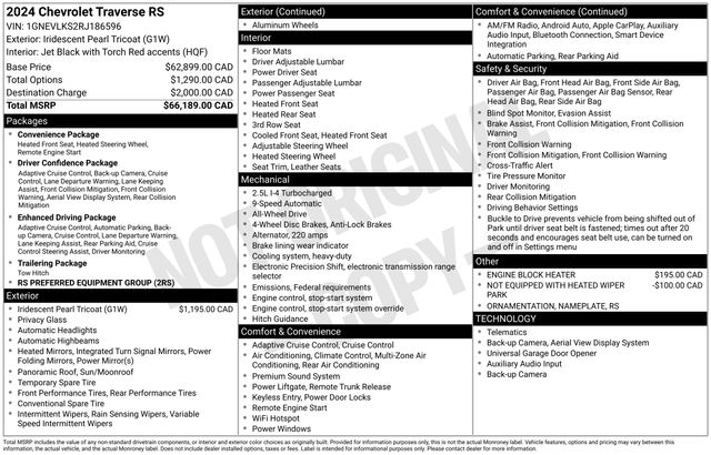 Discover the exceptional 2024 Chevrolet Traverse RS, a versatile and well-equipped SUV that's ready to elevate your driving experience. With its sleek exterior, advanced technology, and impressive performance, this Traverse is the perfect companion for your adventures.