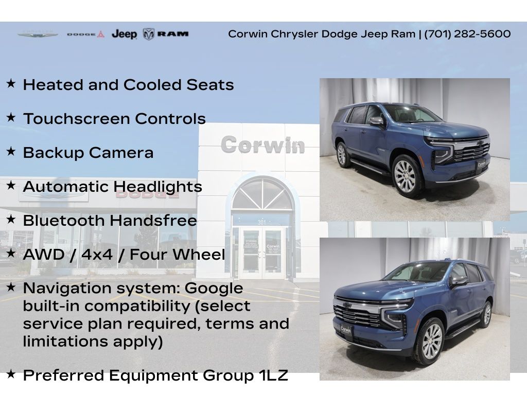 TIME TO SPRING INTO APRIL AT CORWIN CHRYSLER DODGE JEEP RAM OF FARGO!! WE HAVE SAVINGS ON ALL OF OUR PRE-OWNED VEHICLES AVAILABLE!! WE HAVE ONE OF THE LARGEST SELECTIONS OF INVENTORIES IN OUR AREA AT ONE SINGLE LOCATION !! Recent Arrival! Priced below KBB Fair Purchase Price! Lakeshore Blue Metallic 2025 Chevrolet Tahoe Premier 4D Sport Utility 4WD EcoTec3 5.3L V8 CARFAX One-Owner. Clean CARFAX.