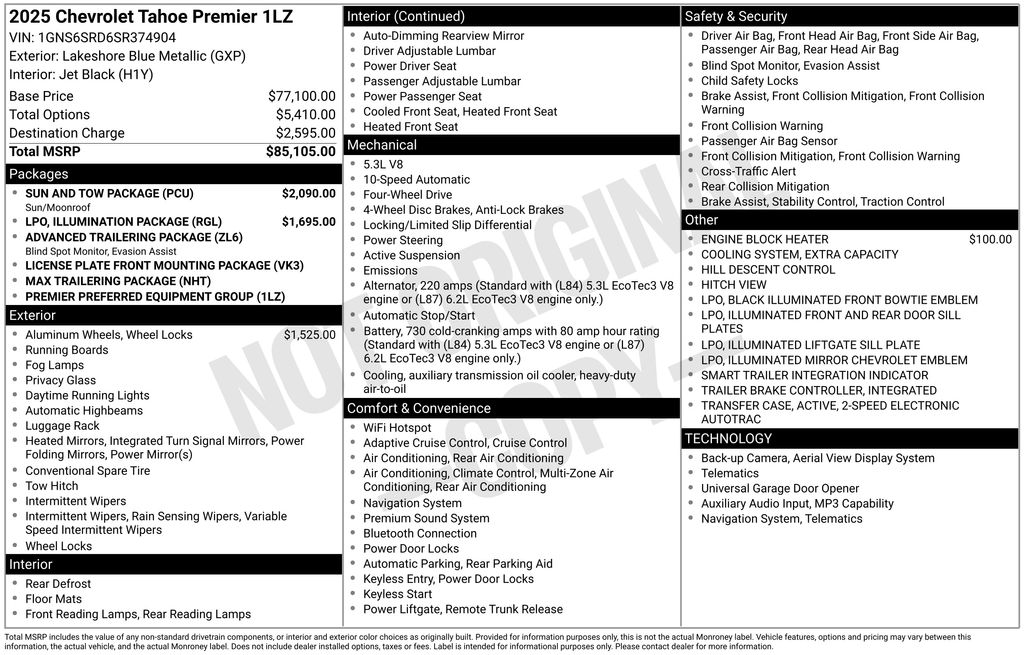 This Chevrolet Tahoe is well equipped and includes these key features and benefits, Heated and Cooled Seats, Touchscreen Controls, Backup Camera, Automatic Headlights, Bluetooth Handsfree, AWD / 4x4 / Four Wheel, 1st and 2nd Row Color-Keyed Carpeted Floor Mats, 2-Speed Active Electronic AutoTrac Transfer Case, 20" x 9" Polished Aluminum Wheels, 3-Spoke Wrapped Steering Wheel, 3rd Row 60/40 Power-Folding Split-Bench Seat, Advanced Trailering Package, Auto-Dimming Inside Rear-View Mirror, Black Illuminated Front Bowtie Emblem, Blind Zone Steering Assist with Trailering, Bose 10-Speaker Centerpoint Surround Audio System Feature, Bright Front and Rear Door Sill Plates, Chrome Door Handles with Body-Color Strip, Chrome Mirror Caps, Color-Keyed Carpeting Floor Covering, Dual Exhaust System, Dual-Pane Power Panoramic Sunroof, Floor Console, Front Bucket Seats, Front LED Fog Lamps, Front Pedestrian and Bicyclist Braking, Frontal Driver and Outboard Passenger Airbags, Heated 2nd Row Outboard Seats, Heated front seats, Heated Steering Wheel, Hill Descent Control, Hitch View with Pan/Zoom Image Adjustment, Illuminated Front and Rear Door Sill Plates, Illuminated Liftgate Sill Plate, Illuminated Mirror Chevrolet Emblem, Illumination Package, Integrated Trailer Brake Controller, LED Headlamps with LED Daytime Running Lamps, LED Tail Lamps, License Plate Front Mounting Package, Magnetic Ride Control Suspension, Max Trailering Package, Memory Settings, Navigation system: Google built-in compatibility (select service plan required, terms and limitations apply), Outside Heated Power-Adjustable Mirrors, Power Release 2nd Row Bucket Seats, Power Tilt and Telescopic Steering Column, Preferred Equipment Group 1LZ, Rear Power Liftgate, Remote Start, SiriusXM with 360L Trial Subscription, Smart Trailer Integration Indicator, Sun and Tow Package, Universal Home Remote, Ventilated front seats, Wireless Phone Charging. Odometer is 8411 miles below market average!