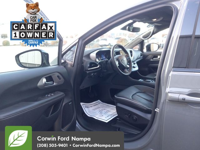 Engineered for families, our Accident Free, One Owner with Low Mileage 2023 Chrysler Pacifica Plug-In Hybrid Limited Minivan levels up with enhanced features in Ceramic Gray! Motivated by a 3.6 Liter Hybrid V6 and Dual Electric Motors serving up a combined 260hp to an E-Flite CVT. This Front Wheel Drive minivan can go gas-free on short trips with nearly 32 miles of EV range, and gas-hybrid mode extends your boundaries with 490 miles of range at 30mpg combined. Our Pacifica is stylish and functional with a dual-pane sunroof, LED lighting, a hands-free liftgate, power sliding side doors, and alloy wheels,