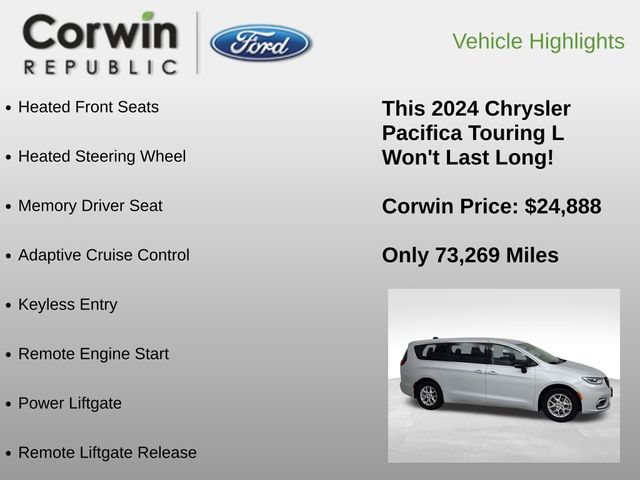 Discover the 2024 Chrysler Pacifica Touring L, a versatile and well-equipped minivan that's ready to elevate your driving experience. This stunning Silver Mist Clearcoat model boasts an impressive array of features that cater to your every need.
