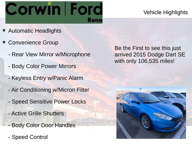 Recent Arrival! This Dodge Dart is well equipped and includes these key features and benefits, Automatic Headlights, Active Grille Shutters, Air Conditioning w/Micron Filter, Body Color Door Handles, Body Color Power Mirrors, Convenience Group, Keyless Entry w/Panic Alarm, Rear View Mirror w/Microphone, Remote USB Port, Speed Control, Speed Sensitive Power Locks, Steering Wheel Mounted Audio Controls, Uconnect Voice Command w/Bluetooth, Underbody Aerodynamic Treatment. CARFAX One-Owner. Available at Corwin Ford Reno located at 11111 South Virginia St.