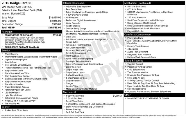 2015 Dodge Dart SE FWD 2.0L I4 DOHC Laser Blue Pearl Coat