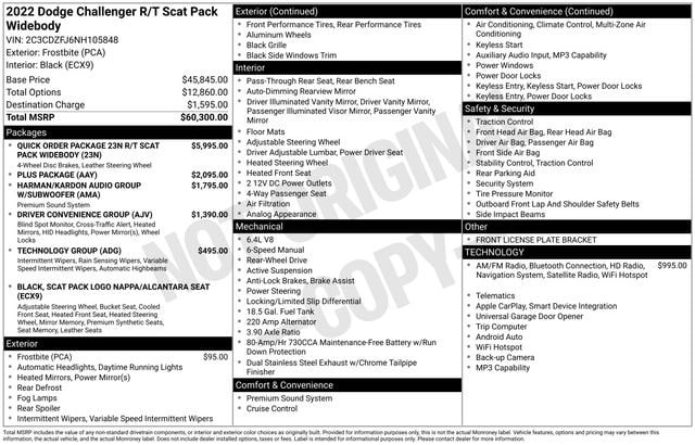 Experience the thrill of pure power with this 2022 Dodge Challenger R/T Scat Pack Widebody. Boasting a SRT HEMI 6.4L V8 engine paired with a Tremec 6-Speed Manual transmission, this high-performance coupe delivers an exhilarating driving experience that's sure to captivate your senses.