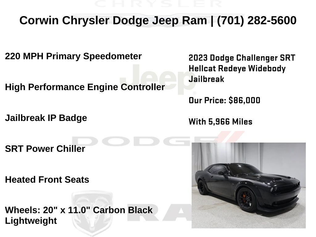 This Dodge Challenger is well equipped and includes these key features and benefits, Heated Seats, Navigation System, Touchscreen Controls, Backup Camera, Automatic Headlights, Bluetooth Handsfree, One Owner, 220 MPH Primary Speedometer, Black Seat Belts, Blind Spot & Cross Path Detection, Body Color Exterior Mirrors, Driver Convenience Group, Exterior Mirrors w/Heating Element, Heated Front Seats, High Performance Engine Controller, High-Intensity Discharge Headlamps, Jailbreak IP Badge, Power Multi-Function Foldaway Mirrors, Quick Order Pkg 27D Hellcat Redeye Widebody Jailbreak (DISC), Redeye Badging, SRT Power Chiller, Wheels: 20" x 11.0" Carbon Black Lightweight, Widebody Competition Suspension, Widebody Fender Flares.
