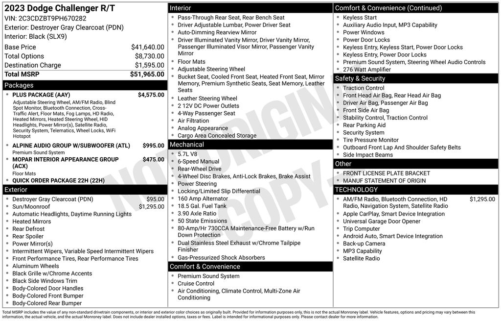 This Dodge Challenger is well equipped and includes these key features and benefits, Touchscreen Controls, Backup Camera, Automatic Headlights, Bluetooth Handsfree, Sunroof/Moonroof, 1-Yr SiriusXM Guardian Trial, 276 Watt Amplifier, 4G LTE Wi-Fi Hot Spot, 506 Watt Amplifier, 8.4" Touchscreen Display, 9 Amplified Speakers w/Subwoofer, Alpine Audio Group w/Subwoofer, Apple CarPlay, Black-Edged Premium Floormats, Blind Spot & Cross Path Detection, Body Color Exterior Mirrors, Compass Gauge, Deluxe Security Alarm, Dodge Performance Pages, Door Trim Panel w/Ambient Lighting, Exterior Mirrors w/Heating Element, For Details, Visit DriveUconnect.com, Front Fog Lamps, Google Android Auto, GPS Antenna Input, HD Radio, Heated Steering Wheel, High-Intensity Discharge Headlamps, Integrated Center Stack Radio, Integrated Voice Command w/Bluetooth, Line Lock, Media Hub (2 USB, AUX), Mopar Bright Door Sills, Mopar Interior Appearance Group, MOPAR Premium Floor Mats w/Logo, Nappa/Alcantara Performance Seats, ParkView Rear Back-Up Camera, Plus Package, Power Multi-Function Foldaway Mirrors, Power Sunroof, Power Tilt/Telescope Steering Column, Premium-Stitched Dash Panel, Quick Order Package 22H, Radio: Uconnect 4C w/8.4" Display, Rhombi Illum Air Catcher Headlamp, Shark Fin Antenna, SiriusXM Satellite Radio, Surround Sound, Trunk Mat w/Logo, USB Host Flip.