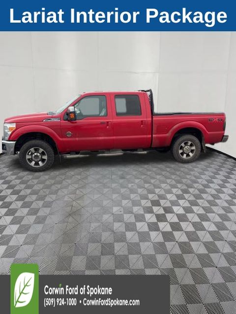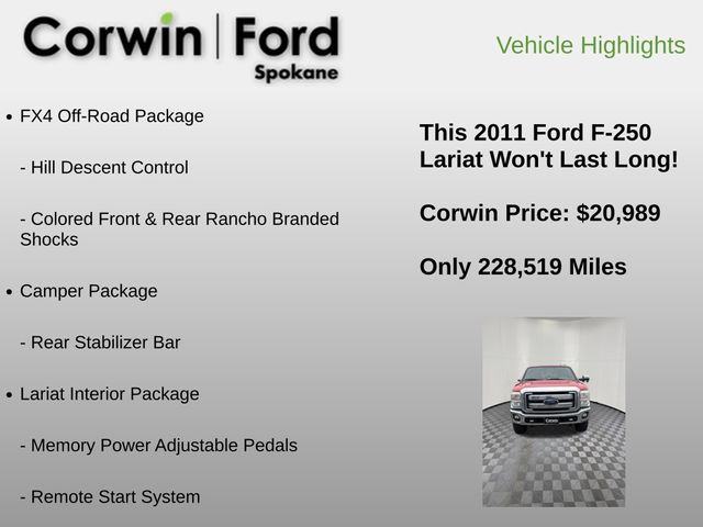 Recent Arrival! Get behind the wheel of our Diesel-powered 2011 Ford F-250 Lariat Crew Cab 4X4 shown in Vermillion Red! Powered by a TurboCharged 6.7 Liter PowerStroke Diesel V8 that offers 400hp teamed with a TorqShift 6 Speed SelectShift Automatic transmission for incredible pulling power. Work or play, you will feel confident with the smooth control and handling of this Four Wheel Drive. F-250 is built strong with significant payload and towing capacity, and powers you through challenging terrain, plus fog lights, headache rack, spray-on Bedliner, running boards, and a shiny chrome grille/bumper add style.