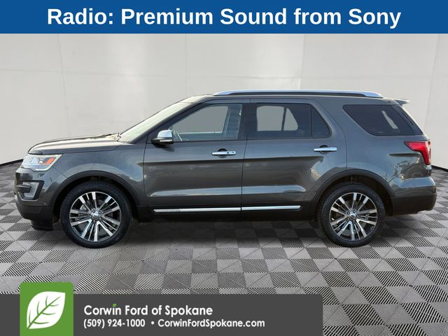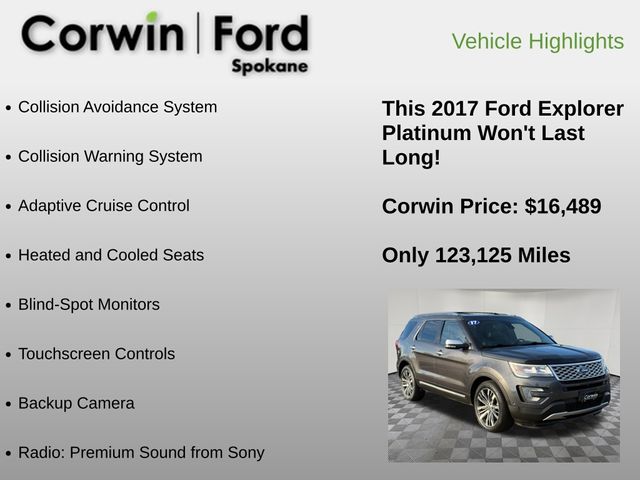 Recent Arrival! Our No Accidents Reported 2017 Ford Explorer Platinum 4WD in Magnetic delivers confident strength and composed handling with bold design. Powered by a Twin TurboCharged 3.5 Liter EcoBoost V6 offering 365hp connected to an innovative 6 Speed SelectShift Automatic transmission. Our Four Wheel Drive delivers responsive steering and smooth handling that will have you looking for reasons to get out and find adventure, while delivering nearly 22mpg on the highway while showing off beautiful wheels and a distinct grille.