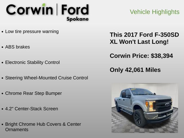 Recent Arrival! LOCAL TRADE! Priced below KBB Fair Purchase Price! Our No Accidents Reported 2017 Ford F-350 XL Crew Cab 4X4 is outstanding in Ingot Silver! Powered by a TurboCharged 6.7 Liter PowerStroke Diesel V8 that generates 440hp and 925lb-ft of torque paired with a heavy-duty SelectShift 6 Speed Automatic transmission with tow/haul mode. This Four Wheel Drive team offers a lighter body and stronger frame than ever before and is ready to take on whatever you throw at it with precision and ease.