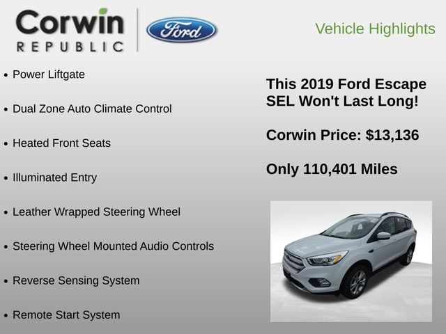 Discover the perfect balance of style, technology, and performance in this 2019 Ford Escape SEL. With its sleek white exterior and a wealth of premium features, this SUV is ready to elevate your driving experience.