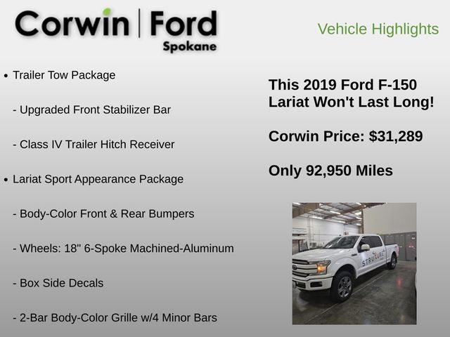 Recent Arrival! Get behind the wheel of our 2019 Ford F-150 Lariat SuperCrew 4X4 that is impressive in Oxford White! Powered by a 5.0 Liter V8 offering 395hp connected to a 10 Speed Automatic transmission for amazing towing and payload capacity. Master each day with robust performance in this Four Wheel Drive F-150 that delivers nearly 22mpg on the highway with a commanding road presence. Our Ford truck features LED lighting, fog lamps, chrome accents, spray-on Bedliner, and alloy wheels to ensure that!