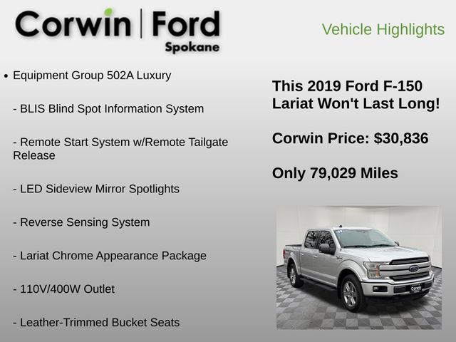 Ford offers a high-strength steel frame, along with sophisticated technologies such as automatic emergency braking, a blind-spot monitor, lane-keeping assistance, dynamic hitch assistance, and a backup camera, all designed to provide peace of mind. With advantages like these, it's no wonder our F-150 Lariat is so popular! Save this Page and Call for Availability. We Know You Will Enjoy Your Corwin Ford Spokane Test Drive Towards Ownership! See us today at Corwin Ford Spokane. Family owned for over 100 years! Excellent selection of New and Used vehicles, Financing options. Serving Spokane, Pasco, Kennewick, Richland, Walla Walla, Hermiston, Umatilla, Yakima, Sunnyside, Grandview, Dayton, Prescott, Denton County, Franklin County, Yakima County, Spokane County, Adams County, Grant County, and the Greater Columbia Basin. *All Prices plus applicable sales tax, license, and a negotiable documentary service fee up to $200 may be added to sales price or capitalized cost of the vehicle. One vehicle unless otherwise noted and subject to prior sale without notice. While supplies last. EPA mileage estimates are for newly manufactured vehicles only. Your actual mileage will vary depending on how you drive and maintain your vehicle.