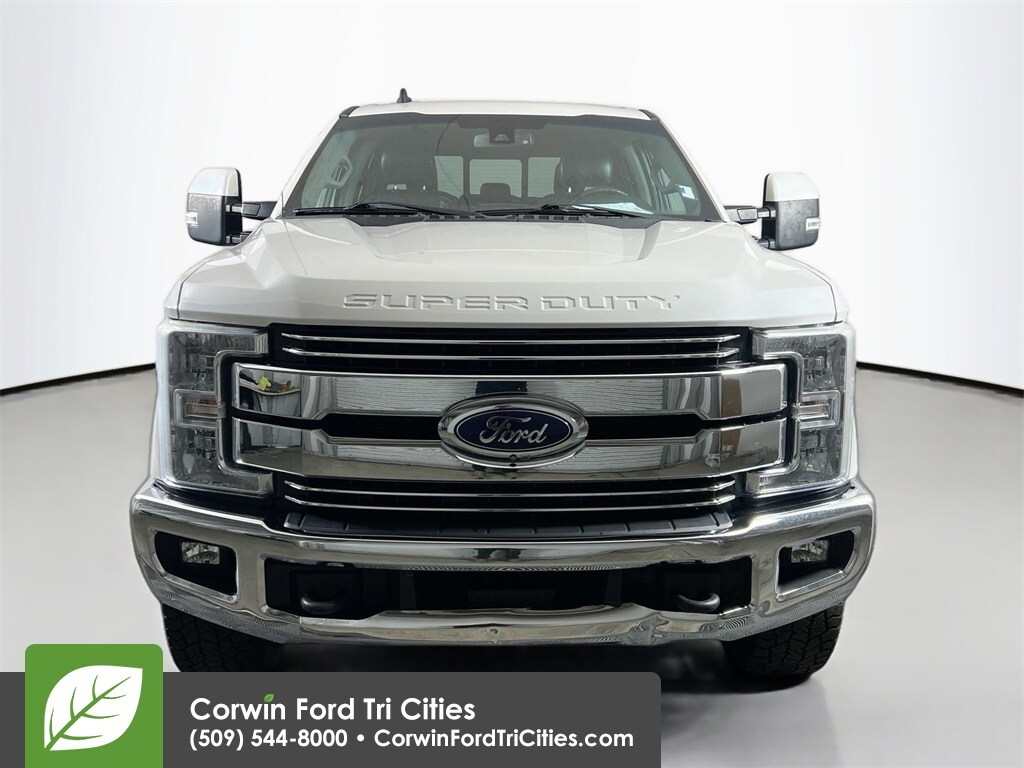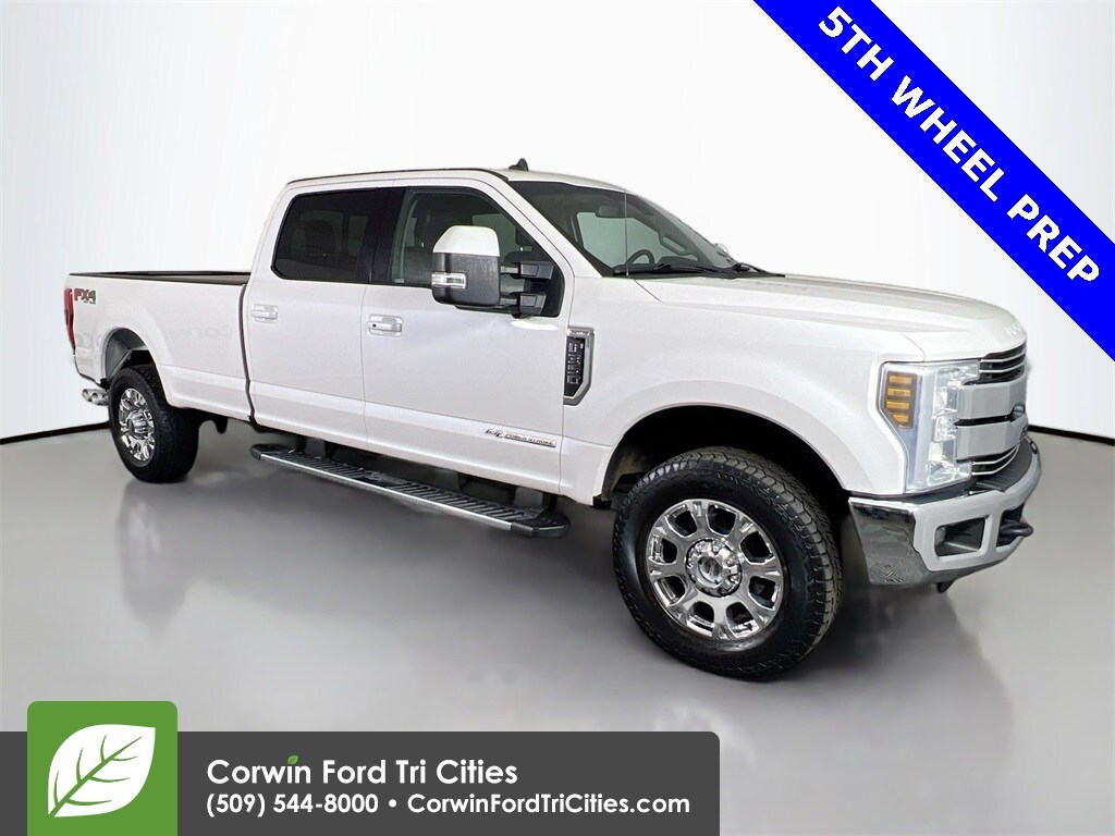 Drive our Diesel powered, Accident Free 2019 Ford F-350 Lariat Crew Cab 4X4 in White Platinum and experience unrivaled Super Duty strength for yourself! Motivated by a 6.7 Liter PowerStroke Diesel V8 offering 450hp and 935lb-ft of torque connected to a 6 Speed SelectShift Automatic transmission with tow/haul mode. Featuring a robust steel frame, this Four Wheel Drive machine is ready to take on whatever you throw at it. Our F-350 is eye-catching, too, with a bold chrome grille, chrome step bars, fog lamps, PowerScope mirrors with LED spotlights, keypad entry, and great-looking wheels!