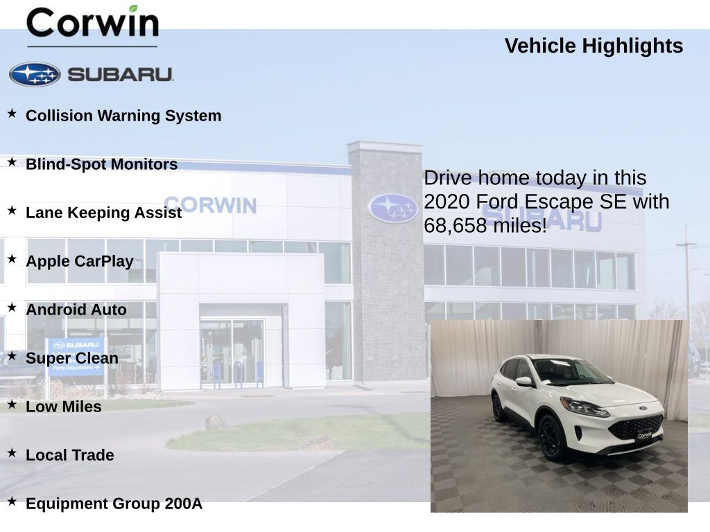 With its stylish exterior, spacious interior, and wealth of advanced technologies, this Escape SE is the perfect companion for your daily commute, weekend adventures, and everything in between. Experience the difference that this well-equipped SUV can make in your life. Visit our showroom today and let us demonstrate how this 2020 Ford Escape SE can exceed your expectations.