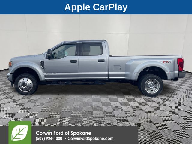 Recent Arrival! Our No Accidents Reported, Diesel driven 2020 Ford F-450 XLT Crew Cab 4X4 Dually is built to be stronger in Iconic Silver! Motivated by a TurboCharged 6.7 Liter PowerStroke Diesel V8 that generates 475hp and 1050lb-ft-of torque for a 10 Speed TorqShift Automatic transmission tuned for massive towing and hauling capability. Also easy to handle, this Four Wheel Drive truck has an expressive exterior that mixes style and functionality with jewel-effect halogen headlights, LED roof clearance lights, heated power trailer mirrors, a chrome grille, matching bumpers, and black running boards.